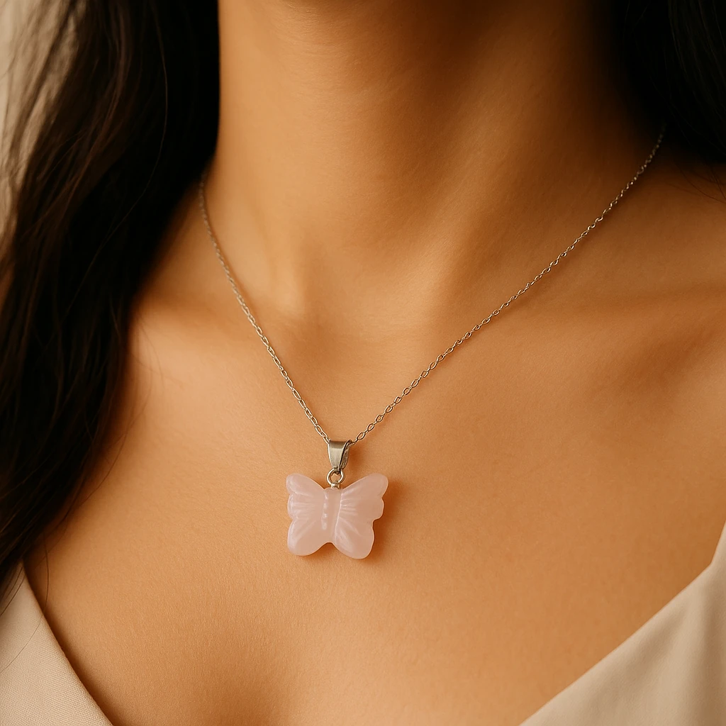 گردنبند سنگ رزکوارتز مدل پروانه مینیمال همراه با زنجیر استیل