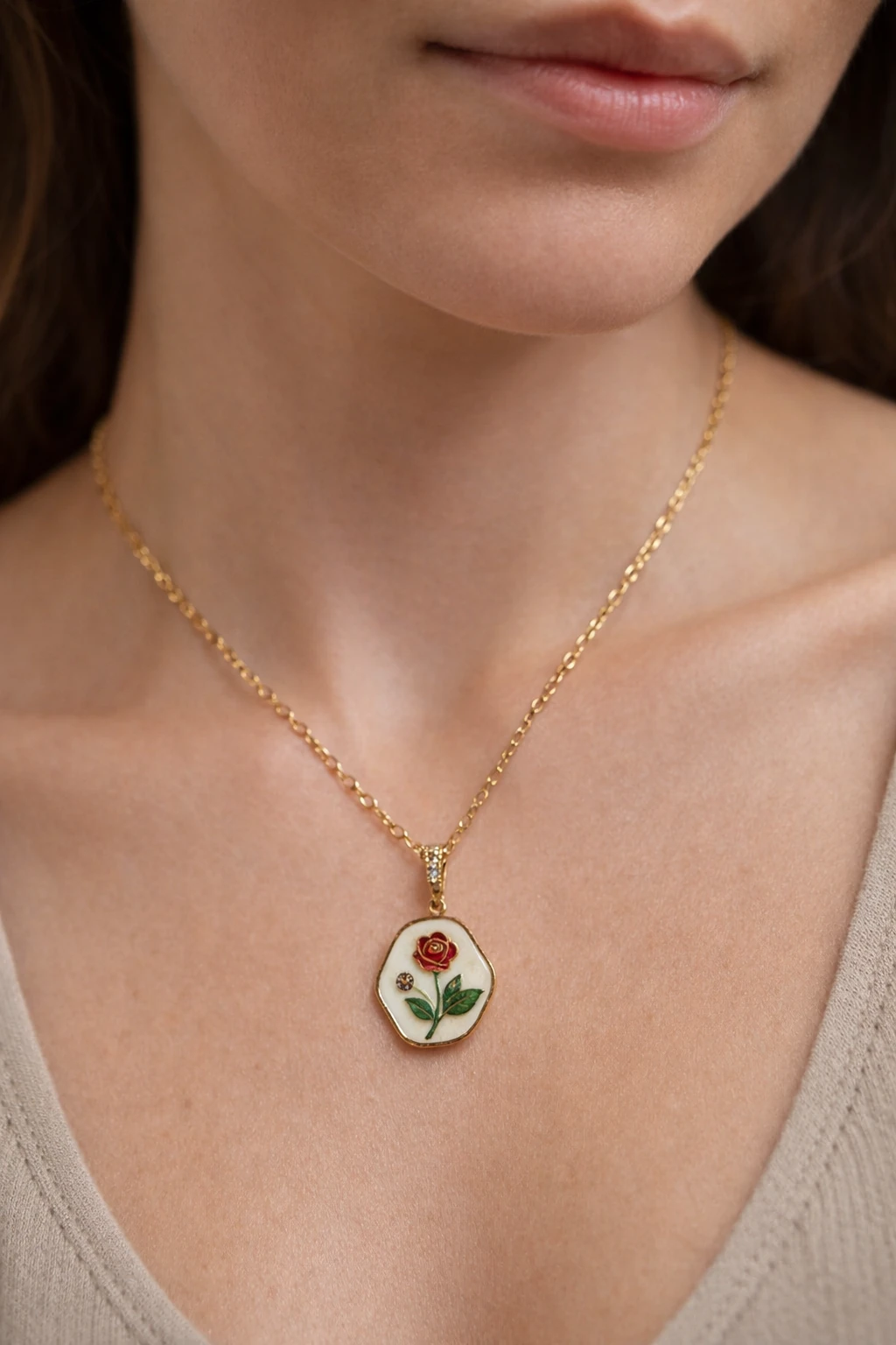 گردنبند میناکاری مدل گل رز همراه با زنجیر استیل هدیه ای حاص و زیبا