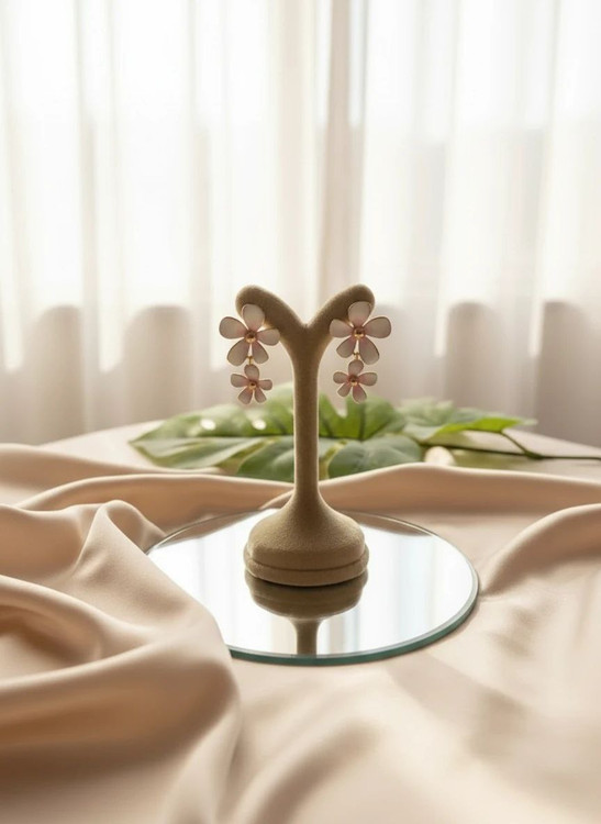 طراحی شکوفهای (میناکاری): این گوشواره دارای دو گل (شکوفه) آویز است. تکنیک میناکاری به گلبرگها رنگی سفید مایل به صورتی بسیار لطیف داده که با مرکز طلایی رنگ، درخششی آرام و چشمنواز ایجاد میکند.