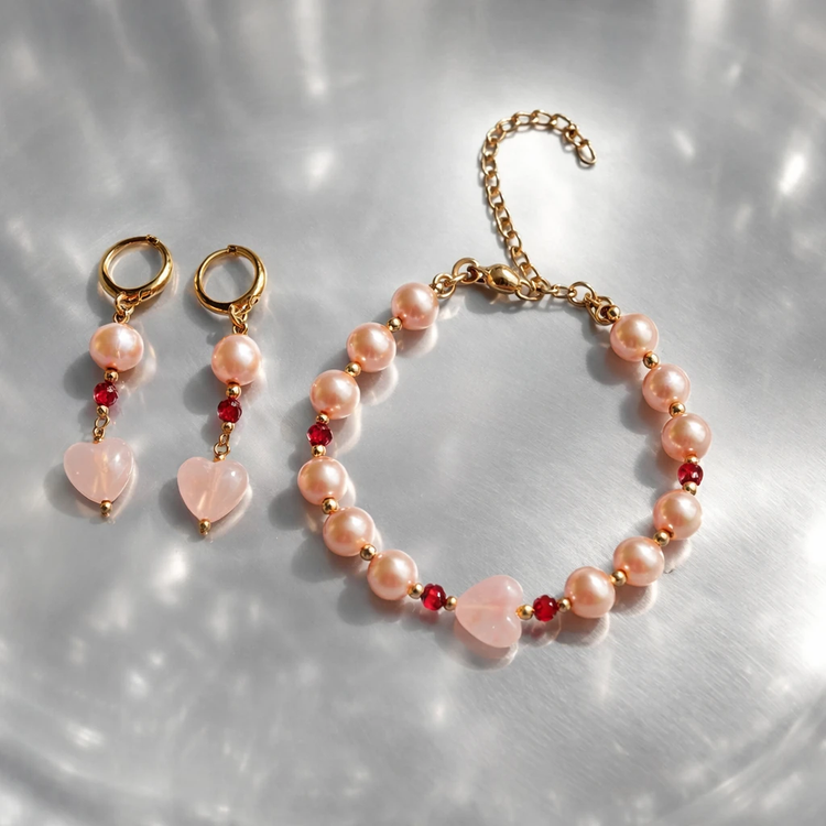 دستبند وگوشواره مروارید طبیعی با یاقوت سرخ و رزکوارتز و حدید | دستساز ظریف زنانه | طول دستبند۱۸ سانت+۶سانت زنجیر سایز| طول گوشواره ۵سانت
