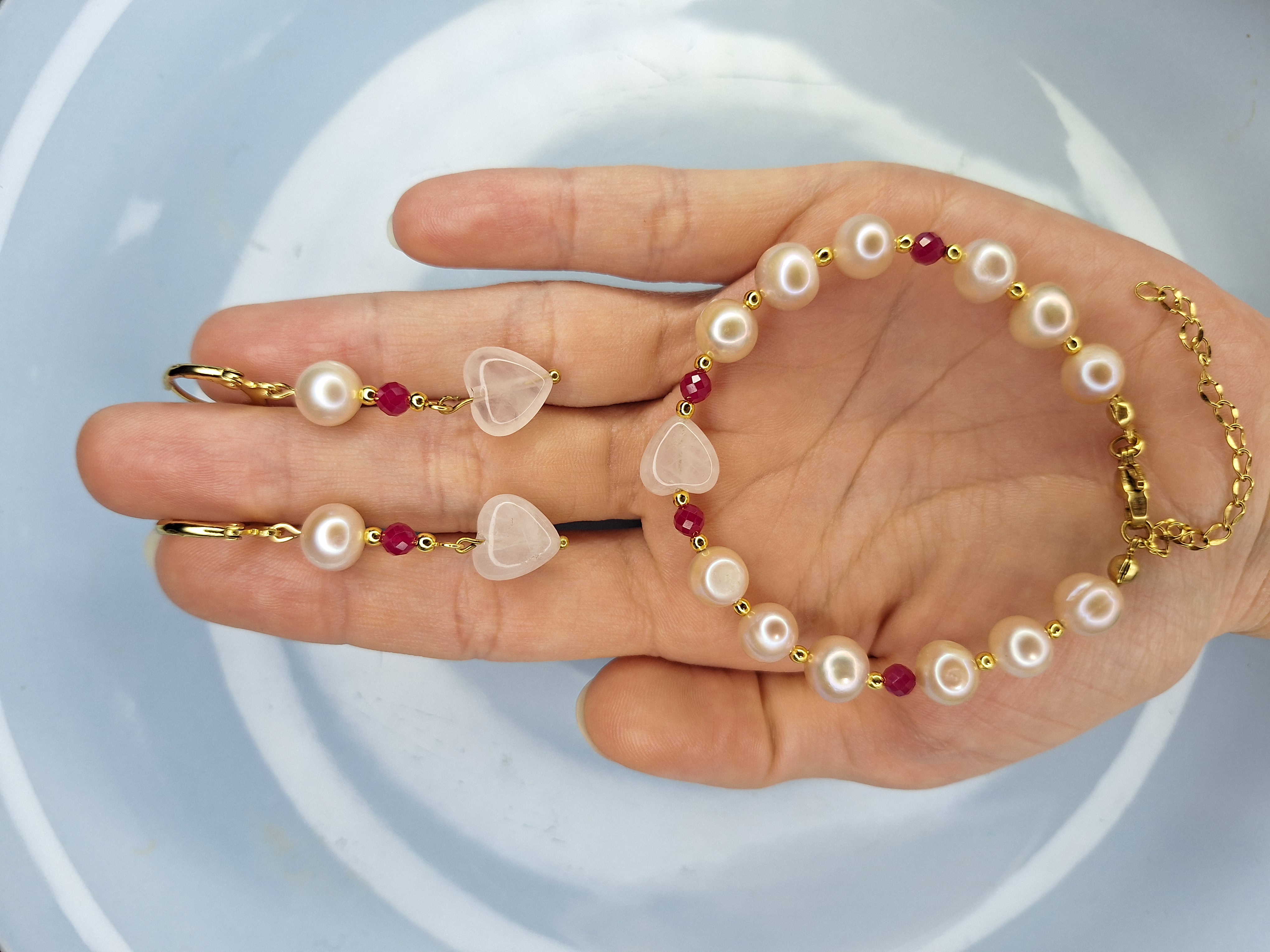 دستبند وگوشواره مروارید طبیعی با یاقوت سرخ و رزکوارتز و حدید | دستساز ظریف زنانه | طول دستبند۱۸ سانت+۶سانت زنجیر سایز| طول گوشواره ۵سانت